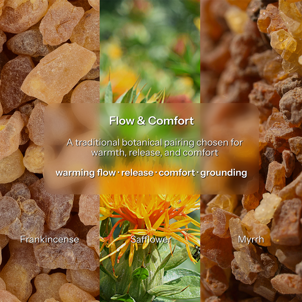 This formula follows a layered pairing system, with warming botanicals forming the foundation and aromatic florals guiding balance above.