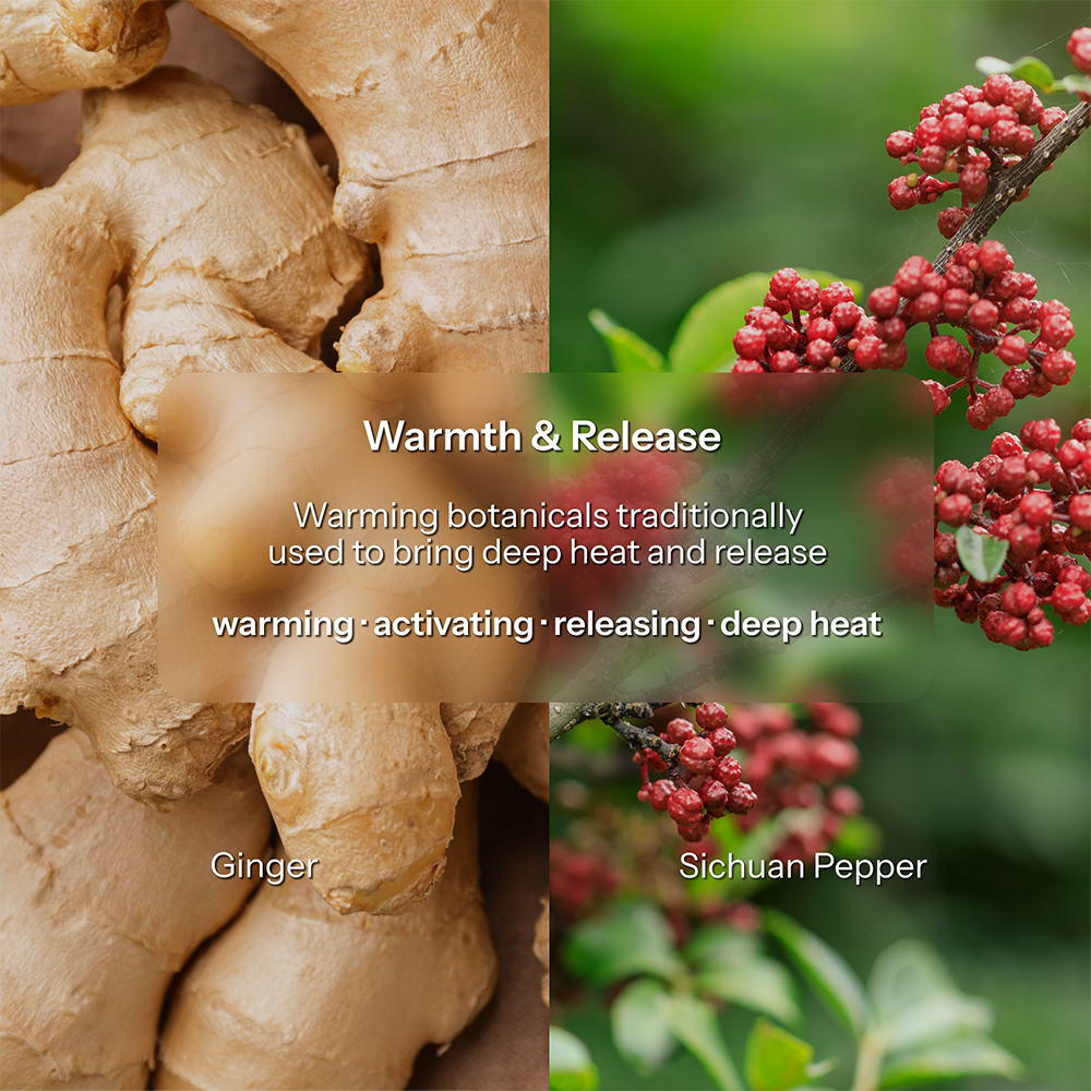 The Root Tonic builds the base of the ritual. Botanicals such as Sichuan pepper, ginger, mugwort, impatiens, frankincense, and myrrh are chosen to establish steady warmth through the feet and lower body, easing areas that tend to feel cold or tight and creating a grounded foundation.